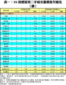 十月初《施政報告》發表前後,市場屏息觀望,而下半月則面對一浪浪的新盤搶客潮,令二手市場處於捱打狀態,導致上月交投量價齊跌;十月份50指標屋苑交投按月再跌14%,連五百宗關口亦不保,只錄得461宗,除連跌7個月外,更創了22個月新低。十月份全港三區交投量中,港島區按月減少1宗,僅錄72宗買賣;九龍區買賣跌14%,全月有187宗;而新界區更跌19%,錄得202宗成交,為跌幅最大的地區。月內交投最旺指標屋苑續為嘉湖山莊及沙田第一城,兩者均錄得28宗成交,緊隨的美孚新村及太古城則分別錄得25宗及20宗買賣。