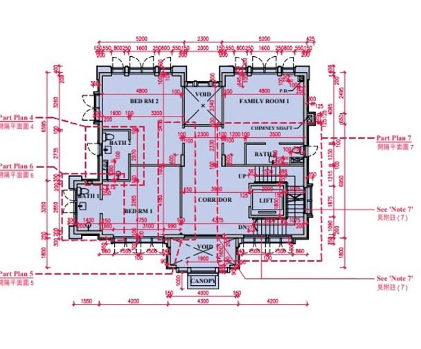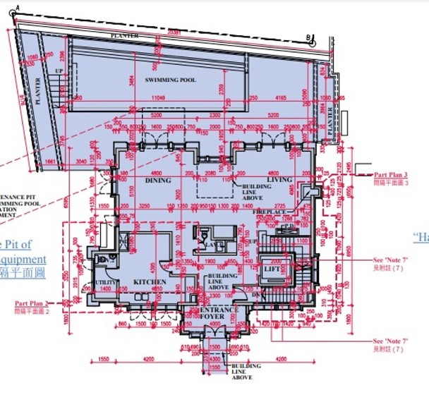 其中,洋房1號面積最大,樓高3層,實用面積有4,740方呎,採五房間隔,連355方呎平台、1,472方呎花園及1,085方呎天台。洋房地庫設有2個停車位,內籠設有私人升降機,飯廳對出的戶外空間設有游泳池。
