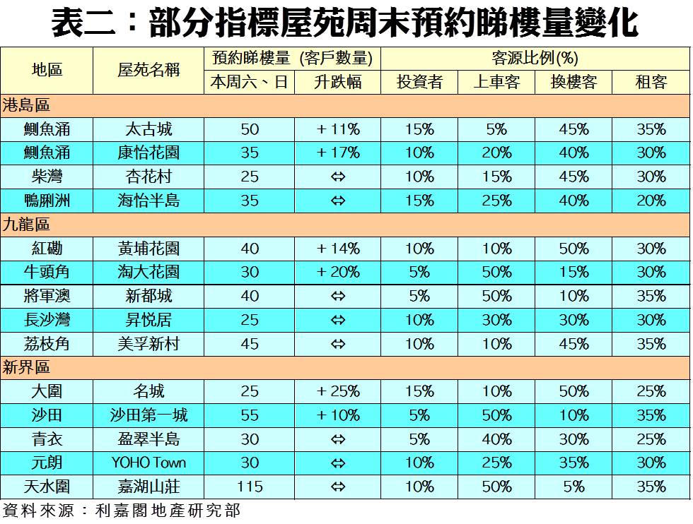 按地區劃分,全港三區指標屋苑的周末預約睇樓量全線造好,其中以港島區增幅較多,該區8個指標屋苑於周末暫錄225組客戶預約睇樓,按周大增4.7%。利嘉閣地產逸樺園分行聯席董事吳玉蘭指出,市場憧憬下月有望通關,加上臨近年尾,促使部分心急買家加快入市,周末康怡花園預約睇樓量按周造好。吳玉蘭表示,有個別業主提供約5%的減幅,刺激一直等待「撈貨」的資金進場,帶動區內二線屋苑成交加快,預期後市可以保持平穩向好。