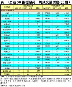 至於,港島區8個指標屋苑上周共錄12宗交投,按周減少4宗或25%,其中南豐新村只錄得1宗成交,較前周的2宗減少50%;藍籌屋苑太古城交投量由前周的7宗,減少29%至上周的5宗;鯉景灣、嘉亨灣、杏花村及藍灣半島期內則暫未錄得成交,齊齊「捧蛋」。此外,在全港50個指標屋苑當中,上周共有14個屋苑錄得「零成交」,較前周的10個增加40%,當中港島區及新界區各佔4個,九龍區則佔6個(詳見表一)。