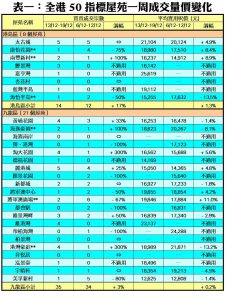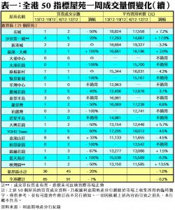 至於,港島區8個指標屋苑上周累錄14宗交投,按周增加2宗或17%,其中南豐新村共錄得2宗成交,較前周的1宗增加1倍;藍籌屋苑太古城交投量維持與前周相同,上周錄得5宗買賣;鯉景灣、嘉亨灣及藍灣半島突破前周「捧蛋」的淡況,上周分別錄得3宗、1宗及1宗成交。此外,在全港50個指標屋苑當中,上周共有13個屋苑錄得「零成交」,較前周的14個減少7%,當中九龍區及新界區各佔7個及5個,港島區則佔1個(詳見表一)。