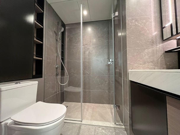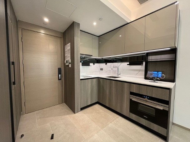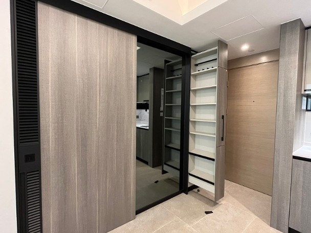 該單位的客飯廳呈方形,連接23方呎露台。大門旁邊附設多層收納櫃及全身鏡。廚房採用開放式設計,配置德國品牌家電,廚櫃內附有收納式摺疊餐桌。睡房裝設趟門,房內備有玻璃大窗,有助引入室外光線。