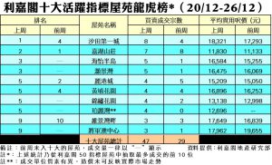 利嘉閣地產董事陳大偉表示,近日新盤推出成功帶動樓市交投氣氛,當中不乏向隅客回流二手市場。另外,經歷過一段長時間拉鋸後,個別業主終於願意減價出售單位,買家有見及此亦加快步伐,趕上今年的「尾班車」入市,二手屋苑成交量有所回升。綜合利嘉閣地產分行數據所得,全港十大活躍指標屋苑在上周(20/12–26/12)錄47宗買賣個案,較前周(13/12–19/12)的29宗按周上升62%,平均每個屋苑錄約4至5宗成交。