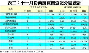 至於以地區劃分,在本行觀察的11個分區當中,共有5區的登記量按月上升。當中以九龍灣區的2.5倍升幅最厲害,由前月的4宗大增至上月共有14宗。此外,觀塘區及上環/中環/金鐘區亦分別錄得5宗及15宗登記,按月各自大增1.5倍及1.1倍。至於逆市錄得最大跌幅者是沙田區,由十月的12宗急跌至十一月的4宗,跌幅高達67%。另外,月內登記量最活躍的觀察區為旺角/油麻地區,月內共錄得17宗。