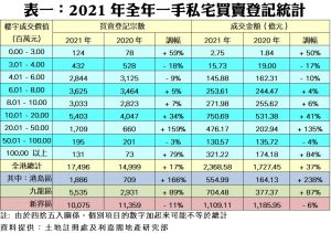展望2022年,陳海潮指出,本地新冠病毒疫情仍然相對受控,遠比其他亞洲以致環球地區為佳,只要疫情沒有在本地大規模爆發,相信發展商將會乘勝追擊,繼續積極推盤趕進度。此外,2022年尚有大家拭目以待的通關憧憬,只要措施一旦落實,將有更多銳意新盤的內地資金南下,有利2022年一手新盤交投;另一方面,今年續有不少大型新盤及鐵路盤有機會應市,因此初步預期,2022年一手私宅買賣登記量可較2021年再增近一成(9%),至約1.9萬宗水平,而登記金額亦料相應上升5.5%,至約2,500億元,屆時將寫下歷史新高。