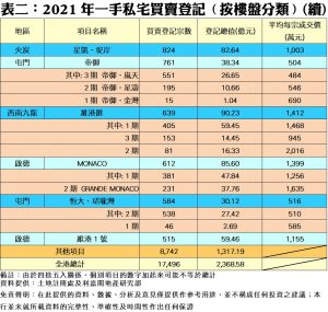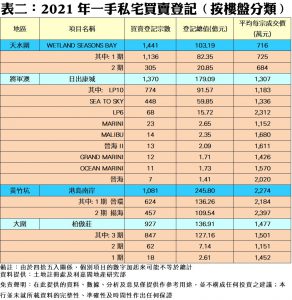 按樓盤分類,2021年熱賣樓盤之首為WETLAND SEASONS BAY 1期,共錄得1,136宗登記;其次柏傲莊3期則有847宗;第三為星凱‧堤岸的824宗登記;再者為LP10的774宗。至於登記排行榜內去年平均每宗成交價最高者是揚海的約2,397萬元,而較低平均價者為帝御‧嵐天的約484萬元(見表二)。