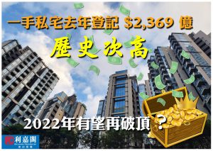 利嘉閣地產研究部主管陳海潮表示,去年絕大部分時間,疫情均良好受控,加上發展商積極推盤,造就去年一手私宅買賣登記量值齊升,較2020年的疫情谷底明顯反彈。根據利嘉閣地產研究部綜合土地註冊處數據,2021年全港共錄一手私宅買賣登記17,496宗,較2020年的14,999宗升約17%,為2008年起計14年來第3多的一年。期內成交總值錄得2,368.58億元,按年大增37%,為1996年有史以來的次高水平;而去年每宗一手私宅登記平均售價約1,353.78萬元,按年上升17.6%,亦為歷來次高的水平。