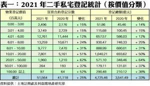 按物業價格劃分,在9個價格組別的登記量當中,錄得全線上升,當中升幅最顯著者為2,001萬至5,000萬元的組別(見表一),錄得1,960宗登記,按年急升62%;其次為1億元以上組別,共錄得97宗登記,按年亦漲52%,反映去年疫情放緩之下,多了換樓客及投資者入市,高價物業反彈幅度更急勁。至於在放寬按保樓價上限的政策下,去年最強勁的購買力仍然集中在介乎401萬至1,000萬元以內的3個銀碼組別,當中登記最多的是601萬至800萬元的組別,去年共錄得13,259宗登記,按年升24%。至於400萬元以下的兩個超細價組別,各有二千多至三千多宗登記,按年同錄15%升幅,為升幅較少的兩個組別。