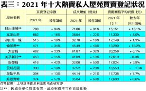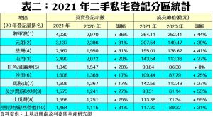 按地區觀察,2021年分區熱賣的三甲排名依次是將軍澳(4,030宗)、元朗(3,137宗)及荃灣(2.562宗),三者按年升幅介乎31%至36%;當中去年升幅最突出者就是將軍澳區,較2020年的2,970宗登記按年大升36%;至於堅尼地城/西營盤區亦升31%,錄1,464宗登記,為升幅第三大地區。至於,馬鞍山及沙田區為升幅最少的地區,但按年也同升17%,表現尚算不俗(見表二)。