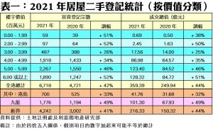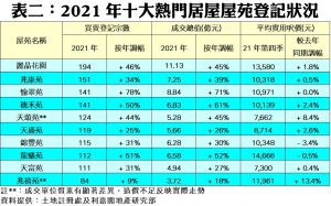 如按屋苑細分(見表二),2021年以九龍灣麗晶花園的成交登記量最多,共錄得194宗買賣,較2020年的133宗大增46%;至於屋苑期內成交總值11.13億元,按年增加45%,而平均實用呎價則按年上升1.8%。