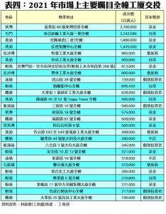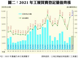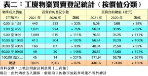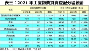 2021年全年累計,工廈買賣登記共錄得3,825宗,較2020年度的2,097宗急升82%,涉及買賣合約總值446.32億元,大漲1.56倍;宗數為2019年,即社會運動及新冠疫情相繼爆發以來的3年新高,而金額同為近3年最多,且是史上第四高水平。去年工廈全年登記量大升,主要受惠撤銷非住宅物業雙倍印花稅,加上疫情好轉令市道回暖,帶動工廈登記量由3月至8月,連續6個月按月均錄逾三百宗登記,成為近年少見的旺市;惟下半年因股市反覆走低,而令登記稍有回落,但仍接近三百宗邊緣的高位,反映逆市下,工廈表現仍然穩定及持續受捧。