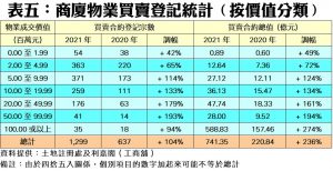 總結2021年全年,商廈整體買賣登記錄得1,299宗,較2020年的637宗大升1倍(104%),是自歷史谷底反彈後兼創近3年新高,亦為期內首度擺脫不足千宗的淡況。至於商廈買賣合約登記總值方面,去年錄得2.36倍的驚人升幅,高見741.35億元,在「疫」市之中寫下歷史新高紀錄;主因是去年12月錄得一宗疑似內部轉讓的太古廣場一座註冊登記,涉及金額逾289.48億元,倘撇除此宗個案,實際登記金額約為451.87億元,按年升約1.05倍,與登記量升幅相若。