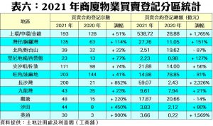 從地區層面分析,在本行定期觀察的11個主要商業區中(見附錄表六),2021年登記量升幅最大者為葵涌區,全年共錄得30宗登記,按年大升9倍;其次長沙灣區亦升8.5倍,至200宗登記,反映一些以往廠區新建的商廈在疫情之下大受追捧。另一方面,2021年最貴重的商廈登記個案除了前述太古廣場一座外,其次為交易廣場第三座涉資的167.28億元,再者是同地的交易廣場富臨閣的25.68億元,亦因此帶動全年總金額得以創下歷史新高。在去年的十大貴重商廈登記之中,約有7宗屬於全幢物業,另有3宗則為全層物業。