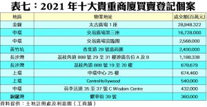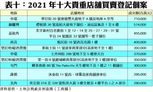 2021年十大貴重店舖買賣中(見附錄表十),最矚目者為中環畢打街20號會德豐大廈地下A舖及地庫A室等的7.10億元登記;其次為銅鑼灣禮頓道36號嘉柏大廈地下舖位、油站設施及1至6樓涉資的5.74億元。