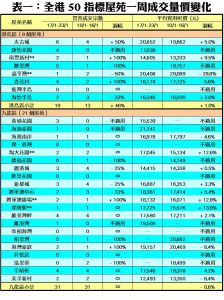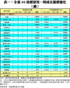 至於,港島區8個指標屋苑上周共錄19宗交投,按周增加6宗或46%,其中南豐新村及杏花村成交量各自按周增加1倍,期內分別錄得2宗及4宗買賣;藍籌屋苑太古城上周共有6宗買賣,較前周的4宗增加50%;鯉景灣及藍灣半島上周則暫未聞交投,雙雙「捧蛋」。此外,在全港50個指標屋苑當中,上周共有16個屋苑錄得「零成交」,與前周的數量相同,當中九龍區及新界區各佔7個,港島區則佔2個(詳見表一)。