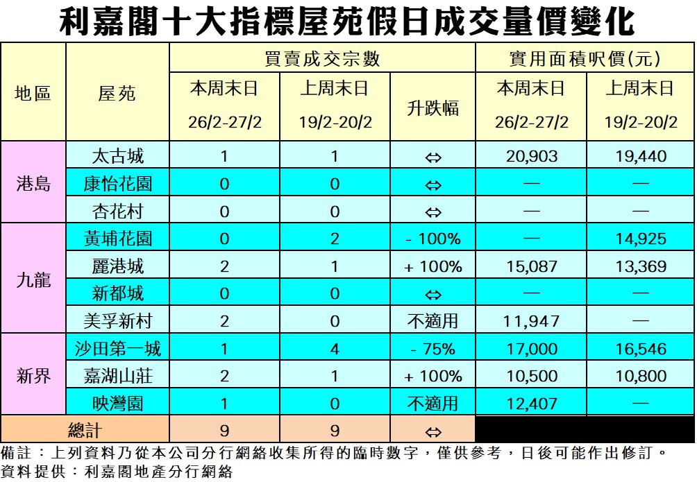 《利嘉閣十大指標屋苑假日二手實況》 放寬按保具吸引力 買家加速入市 十大屋苑周末錄9宗買賣 按周持平 研究報告 2022-02-28 by Chan Derek · Published 2022-02-28