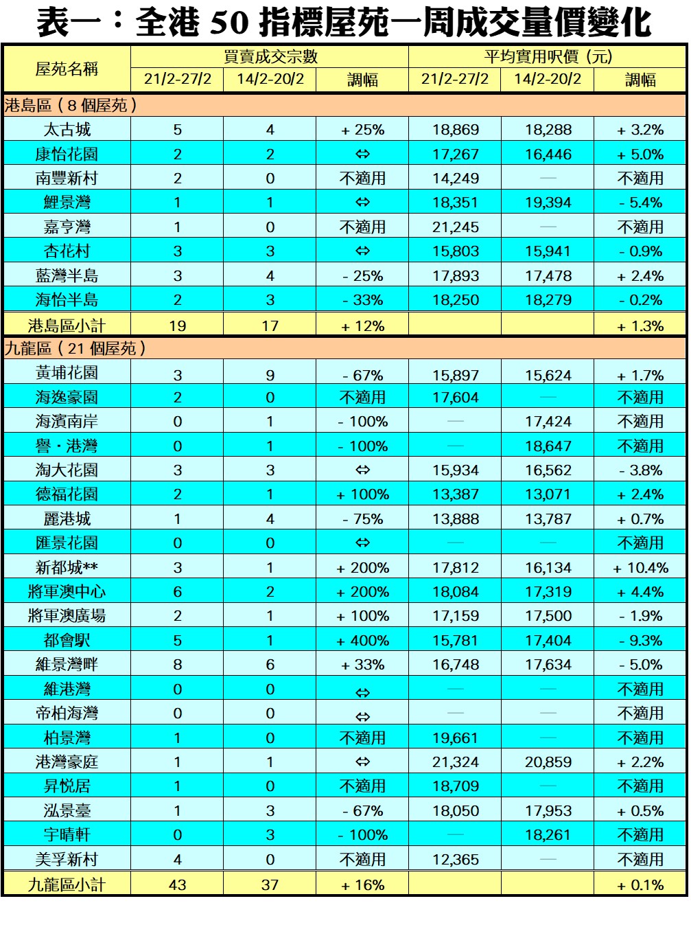 至於港島區8個指標屋苑上周共錄19宗交投,較前周的17宗增加12%,其中太古城錄得5宗買賣,較前周的4宗增加25%;杏花村藍灣半島同樣錄得3宗買賣;康怡花園南豐新村海怡半島各自錄2宗成交;而鯉景灣嘉亨灣則有1宗成交。
