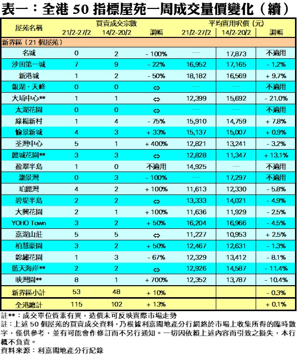 利嘉閣地產董事陳大偉表示,隨政府於上周三在財政預算案宣佈放寬按揭保險計劃,讓價值1,920萬元以內的物業能夠承造更高成數按揭,刺激不少換樓客紛紛在業主收窄議價空間前加快入市,帶動上周二手屋苑交投再下一城。綜合利嘉閣地產分行數據所得,全港50個指標屋苑於上周(21/2—27/2)共錄115宗買賣個案,較前周(14/2—20/2)的102宗增加13%,連升3周,並創去年8月下旬以來的27周最多。