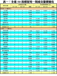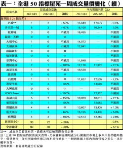 至於港島區8個指標屋苑上周共錄14宗交投,較前周的15宗減少7%,其中嘉亨灣、杏花村及藍灣半島同樣由前周2宗,降至上周1宗買賣,跌幅同為50%。至於康怡花園及太古城分別錄6宗及3宗成交,成為少數較「熾熱」的港島區屋苑。此外,在全港50個指標屋苑當中,上周共有13個屋苑錄得「零成交」,較前周的17個減少4個,當中九龍區及新界區各佔3個及8個,而港島區則只有2個(詳見表一)。