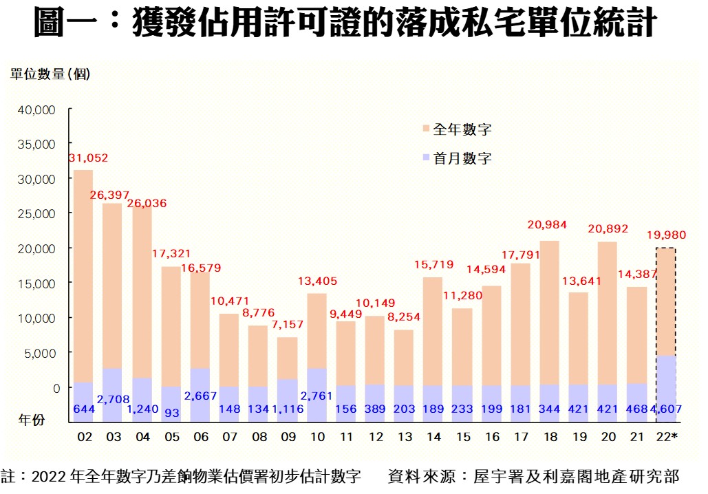 2022年一月私宅「零動工」 廿一年來第7次 大型項目竣工撐起 首月4,607個單位落成