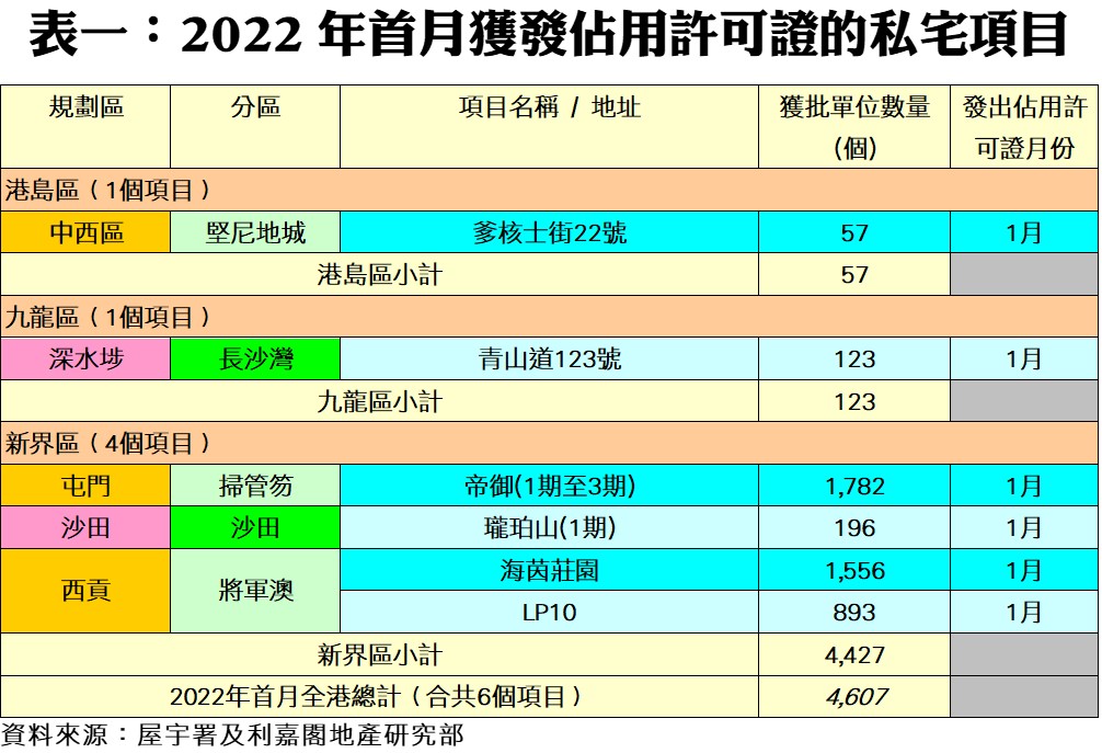 此外,私人住宅落成量方面,2022年一月份全港共有6個項目,共4,607個私人住宅單位落成(以屋宇署發出佔用許可證的樓宇數量為準),較去年十二月份1,762伙急增1.6倍,創近37個月最多。
