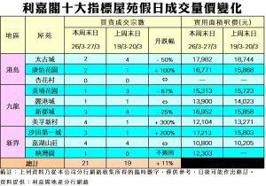 《利嘉閣十大指標屋苑假日二手實況》 疫情續改善 恐議幅漸收窄 買家加快入市 十大屋苑周末買賣21宗 創近44周新高