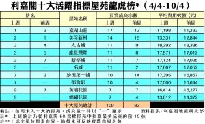 利嘉閣地產董事陳大偉表示,二手屋苑成交熾熱暢旺,主因是近日疫情持續放緩,加上限聚令即將放寬,業主叫價愈趨進取,買家擔心樓價上升下匆匆入市。綜合利嘉閣地產分行數據所得,全港十大活躍指標屋苑在上周(4/4–10/4)錄109宗買賣個案,較前周(28/3–3/4)的83宗按周上升31%,每個屋苑平均錄逾10宗成交。