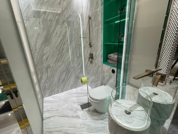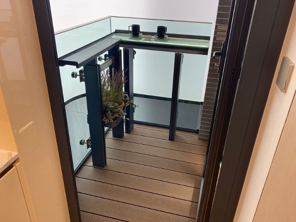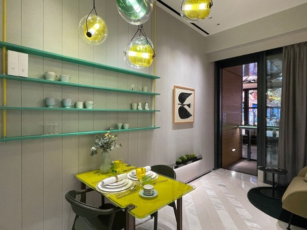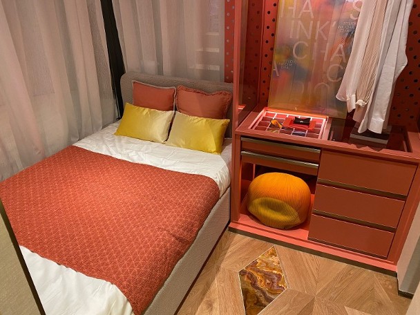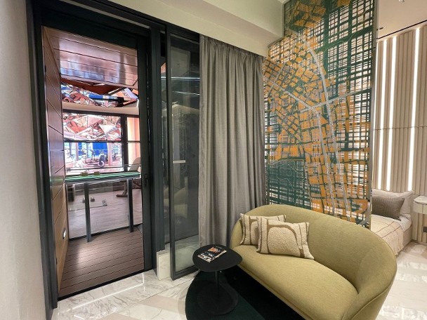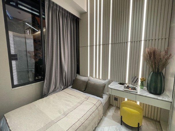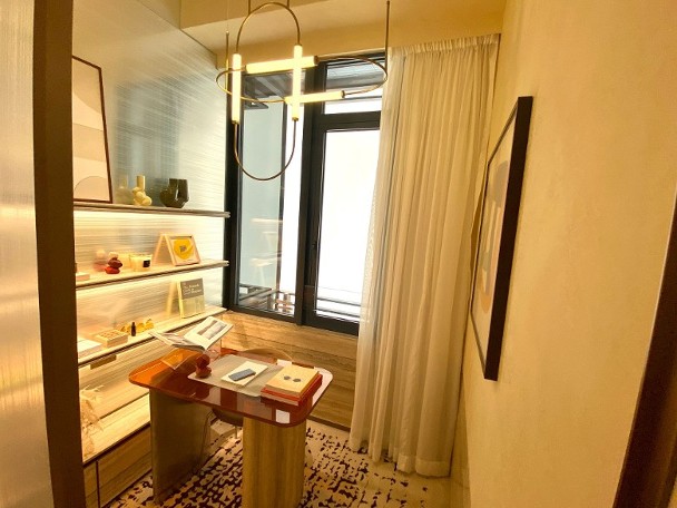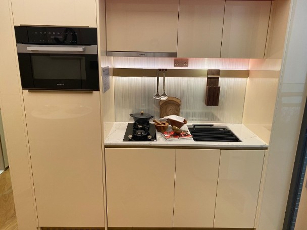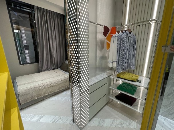 另一個示範單位為2座23樓C室,實用面積320方呎,一房連儲物室間隔,長形客飯廳易於擺放傢俬,外連22方呎露台,同樣採用開放式廚房設計。