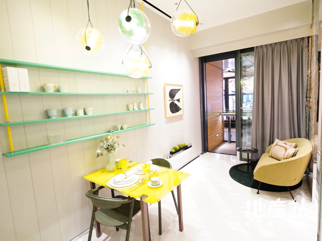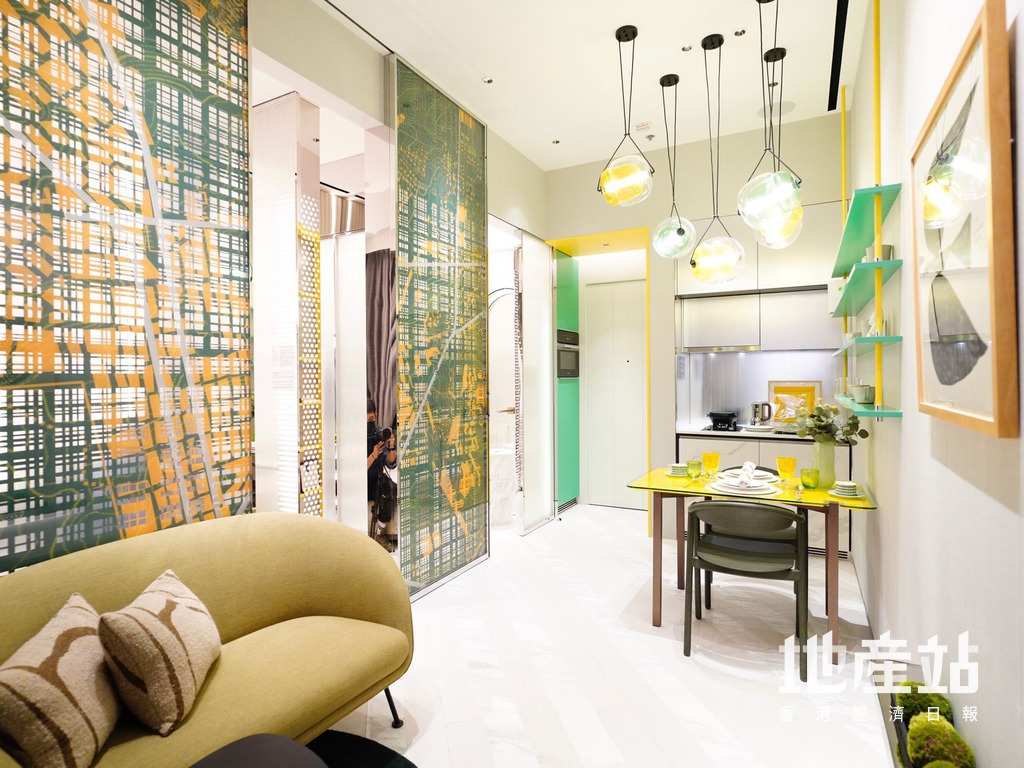 客廳以玻璃趟門連接露台,引入自然光綫,發展商指,設計靈感源於大角咀昔日地形,以綠色比喻海岸線,黃色勾劃社區輪廓。