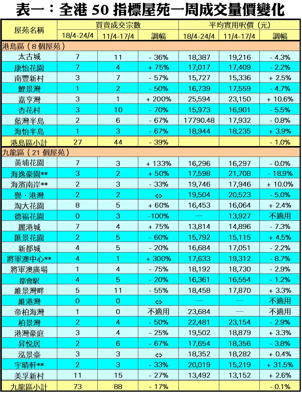 至於九龍區21個指標屋苑上周共錄73宗成交,較前周的88宗減少17%,其中將軍澳廣場成交量由前周的4宗,按周銳減75%至上周只有1宗買賣;昇悅居匯景花園按周分別減少67%及60%,至各自2宗成交;維景灣畔柏景灣各錄5宗及2宗買賣,分別減少55%及50%;而宇晴軒海濱南岸按周各自減少33%,期內同樣只有2宗買賣。此外,在全港50個指標屋苑當中,上周共有4個屋苑錄得「零成交」,與前周數量相同,當中九龍區及新界區各佔2個,而港島區則全數屋苑均有成交(詳見表一)。