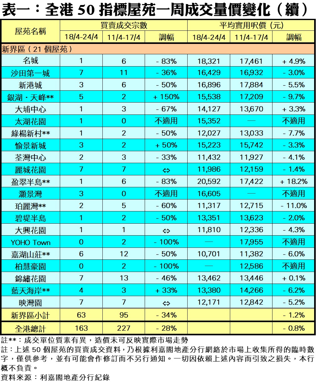 利嘉閣地產董事陳大偉表示,限聚令放寬後市場氣氛明顯轉好,多個發展商隨即推盤收票,一手市場轉趨熱鬧;反觀二手業主因看好樓市前景,叫價持續企硬,導致二手屋苑交投步伐變慢,成交量回落。綜合利嘉閣地產分行數據所得,全港50個指標屋苑於上周(18/4—24/4)共錄163宗買賣個案,較前周(11/4—17/4)的227宗大減28%,連跌兩周,並創近5周低。