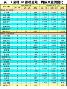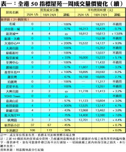 港島區方面,8個指標屋苑上周只錄21宗交投,較前周的29宗減少28%,其中康怡花園由前周7宗買賣,大減至上周只有1宗,按周銳減86%;南豐新村及嘉亨灣成交同樣只有1宗買賣,按周各自大減67%;杏花村成交量則減少25%,至3宗買賣;至於太古城按周減少14%,期內錄6宗成交。此外,在全港50個指標屋苑當中,上周共有14個屋苑錄得「零成交」,較前周僅3個急增11個,當中新界區及九龍區各佔8個及6個,而港島區則全數屋苑均有成交(詳見表一)。
