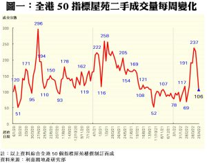 利嘉閣地產董事陳大偉表示,發展商積極於各區推售新盤,刺激市場上積壓已久的購買力大舉進場;而業主憧憬樓市穩步向好,紛紛收窄議價空間,導致二手市場缺乏筍盤,窒礙買賣步伐。綜合利嘉閣地產分行數據所得,全港50個指標屋苑於上周(25/4—1/5)共錄106宗買賣個案,較前周(18/4—24/4)的172宗大減38%,連跌三周,並創近7周最少。