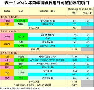 陳海潮指出,首季落成量達政府預測的22,850伙約35%,數字暫時較預期理想,而估計年內仍有不少大型項目將可取得入伙紙,包括火炭「星凱‧堤岸」(1,335伙)、啟德「維港1號」(1,059)、元朗「THE YOHO HUB」(1,030伙)、黃竹坑站「晉環」(800伙)、大圍「柏傲莊I」(783伙)、屯門「OMA BY THE SEA」(517伙)等,再加上其他中小型項目,初步估計2022年全年落成量可重上兩萬伙以上,挑戰2018年後的4年高位。