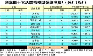 利嘉閣地產董事陳大偉表示,發展商爭相推盤互撼,務求盡快一洗年初頹勢收復失地,吸引了不少準買家入票搶購;雖然二手業主看好後市未肯割價售出單位,但是東鐵線過海段通車帶動各區交投增加,十大指標屋苑成交仍有一定支持。綜合利嘉閣地產分行數據所得,全港十大活躍指標屋苑在上周(9/5–15/5)錄47宗買賣個案,較前周(2/5–8/5)的44宗按周微升7%,每個屋苑平均錄4至5宗成交。
