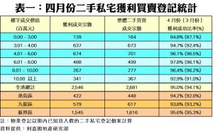 按物業區域劃分,新界區表現最理想,以95.6%之數成為獲利成功比率最高的分區,按月升0.3個百分點;港島區居次,報94.2%,按月升2.2個百分點;至於九龍區最遜色,僅錄得93.8%,按月升0.6個百分點。按物業轉售價格分析(見表一),樓價介乎601萬至800萬元的中價樓組別之獲利比率表現最好,錄得97.8%,且按月升1.7個百分點,涉及宗數488宗;此外,801萬至1,000萬元組別,月內獲利比率達96.4%,按月升0.2個百分點,同樣跑贏整體大市表現。