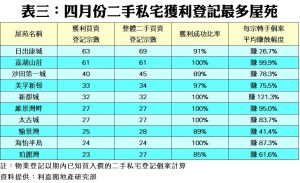 此外,環顧上月10個獲利登記最多的屋苑,當中達百分百獲利的只有半數,而每宗平均賺幅則介乎最少的26.7%至最多的121.3%不等。當中新都城成為錄得每宗轉手個案平均賺幅最高的屋苑,達逾1.21倍。至於上月榜內賺幅最低者仍為平均樓齡相對最低的日出康城,平均每宗只賺約26.7%,其次為愉景灣的41.4%(見表三)。