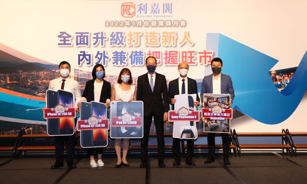 利嘉閣地產總裁廖偉強先生日前於5月份營業員月會中向獲得「終極大獎」的5位幸運兒頒發禮品。其中iPad Air 256GB由尚珒溋分行客戶經理謝少芳(Anita)奪得、Sony PlayStation 5由貝沙灣分行A組客戶主任麥健強(Michael)奪得、iPhone SE 256 GB分別由屯門康麗花園物業顧問李鎧(Oliver)及上水中心1行客戶董事廖嘉姿(Van)奪得,香港文華東方酒店Staycation則由康怡花園分行聯席董事陳家豪(Ryan)奪得。