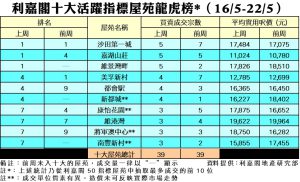 利嘉閣地產董事陳大偉表示,一手新盤市場熾熱暢旺,刺激樓市交投氣氛「V型」反彈回升;雖然二手業主相信後市前景樂觀而未肯割價出售物業,然而仍有自住客與業主拉鋸後決定入市接盤,承托指標屋苑買賣市場。綜合利嘉閣地產分行數據所得,全港十大活躍指標屋苑在上周(16/5–22/5)錄39宗買賣個案,與前周(9/5–15/5)的39宗持平,每個屋苑平均錄近4宗成交。