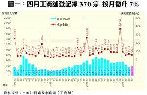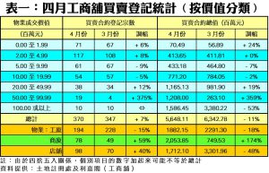 按工商舖三個物業類別劃分,工廈按月登記量逆市繼續下跌,按月交投佔總體比率大降至只有52%。四月全月工廈共錄得194宗登記,按月減少15%,罕見跌穿二百宗水平,而月內買賣登記總額亦跌18%,錄得18.82億元。當中大中細價工廈買賣登記量全面錄得跌幅,其中500萬至1,000萬元以內者按月挫26%,四月只有32宗;而2,000萬至5,000萬元以內及1億元或以上者同告減少25%,分別錄9宗及3宗。