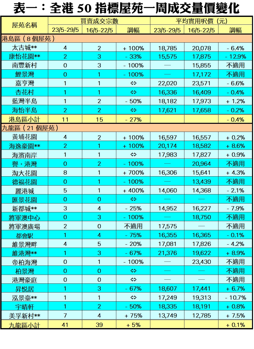 至於九龍區21個指標屋苑上周共錄41宗成交,較前周的39宗增加5%,其中淘大花園成交量突飛猛進,由前周只有1宗,按周急增7倍至上周8宗買賣;麗港城按周大增4倍至5宗成交;黃埔花園及海逸豪園上周成交量按周齊升1倍,分別錄4宗及2宗買賣;而美孚新村錄得7宗買賣,交投量按周增加75%。此外,在全港50個指標屋苑當中,上周共有12個屋苑錄得「零成交」,較前周8個增加4個,當中九龍區佔7個;新界區佔3個,而港島區則有2個屋苑(詳見表一)。