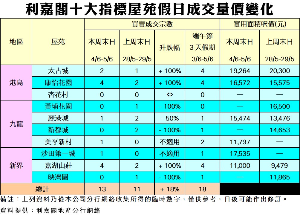 利嘉閣地產總裁廖偉強表示,市場缺乏焦點新盤,同時買家逐漸適應二手業主提價,購買力重新回到二手市場,導致周末十大屋苑交投量輕微回升。綜合利嘉閣地產分行網絡數據,在過去的周末日(6月4日至6月5日)十大指標屋苑累錄13宗二手成交個案,較上周末(5月28日至5月29日) 的11宗,增加2宗或18%;而端午節3天假期(6月3日至6月5日)十大指標屋苑則合共錄得18宗買賣。