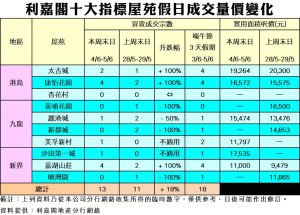 《利嘉閣十大指標屋苑假日二手實況》 市場氣氛好轉 交投輕微回升 十大屋苑周末成交13宗 端午節3天18買賣