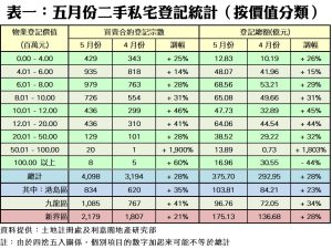 今年五月份,按二手私宅價值分類,9個價格組別的買賣登記量錄得全線上升,當中以樓價5,001萬至1億元組別的19倍升幅最凌厲,登記量由前月的1宗大增至上月的20宗 (見表一),主因是前月基數太低,及上月登記情況亦相對暢旺之故。此外,樓價在1億元以上的高價組別及介乎1,001萬至2,000萬元的組別亦各自大升60%及46%,至分別的8宗及436宗登記。至於登記量佔比最多的601萬至800萬元組別則錄得979宗,按月也升28%。