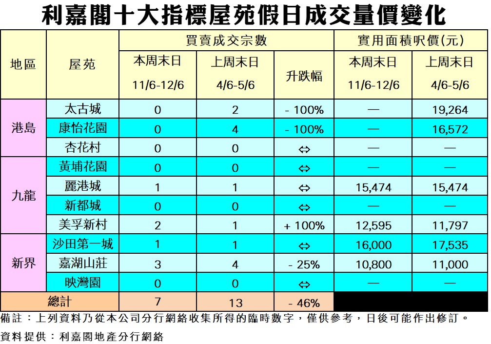 《利嘉閣十大指標屋苑假日二手實況》 新盤搶客兼觀望議息 二手交投創14周新低 十大屋苑周末成交僅7宗 按周急挫46% 研究報告 2022-06-12 by Chan Derek · Published 2022-06-12