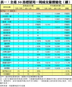至於,九龍區21個指標屋苑上周共錄40宗成交,較前周的28宗增加43%,其中黃埔花園成交量由前周2宗,按周急增2倍至上周連錄6宗買賣;麗港城昇悅居分別錄得2宗成交,各自按周增加1倍;將軍澳中心宇晴軒則各錄3宗交投,分別按周增加50%。此外,在全港50個指標屋苑當中,上周共有16個屋苑錄得「零成交」,與前周的數量相同,當中港島區佔2個;九龍區佔5個,而新界區則佔9個屋苑(詳見表一)。
