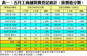 按工商舖三個物業類別劃分,工廈按月登記量終見回升,按月交投佔總體比率亦升至53%。五月全月工廈共錄得242宗登記,按月升25%,為3個月來最多,而月內買賣登記總額更大增84%,錄得34.62億元。當中高價及中細價工廈買賣登記量均有理想升幅,1億元或以上的大碼工廈大增兩倍至9宗,而200萬至500萬元以內者亦按月升41%,月內勁錄117宗登記,成為最旺的銀碼層。