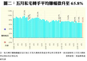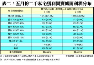 數據顯示,今年五月份每宗私宅轉手個案平均賺幅為65.8%(見圖二),按月微升0.3個百分點,終止兩連跌,但仍處低位徘徊,為2016年9月以來的次低水平。五月份,帳面獲利1倍或以上的轉手個案佔整體二手私宅買賣比例為41.5%,按月升0.7個百分點,共錄1,414宗;至於帳面錄得虧損者有168宗,佔比按月增至4.9%,而平手的個案則有17宗,佔比微跌至0.5%。