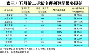 此外,環顧上月10個獲利登記最多的屋苑,當中達百分百獲利的只有3個,而每宗平均賺幅則介乎最少的31.0%至最多的115.2%不等。當中嘉湖山莊成為錄得每宗轉手個案平均賺幅最高的屋苑,達逾1.15倍。至於上月榜內賺幅最低者仍為平均樓齡相對最低的日出康城,平均每宗只賺約31.0%,次低者為愉景灣的45.9%(見表三)。
