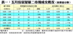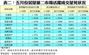 按物業價值劃分(見表一),五月份共有2個組別交投量按月上升,當中價值500至599萬元以內組別交投升幅最為顯著,由四月份的41宗買賣,升至上月46宗,按月增加12%。如按屋苑劃分(見表二),五月份天水圍天盛苑共錄9宗買賣,按月增加13%,而涉及總值按月亦增加26%至約4,353.8萬元;另外,屏欣苑月內交投亦大增2倍至9宗,連同天盛苑雙雙力壓同儕成為交投最活躍的綠表居屋屋苑。